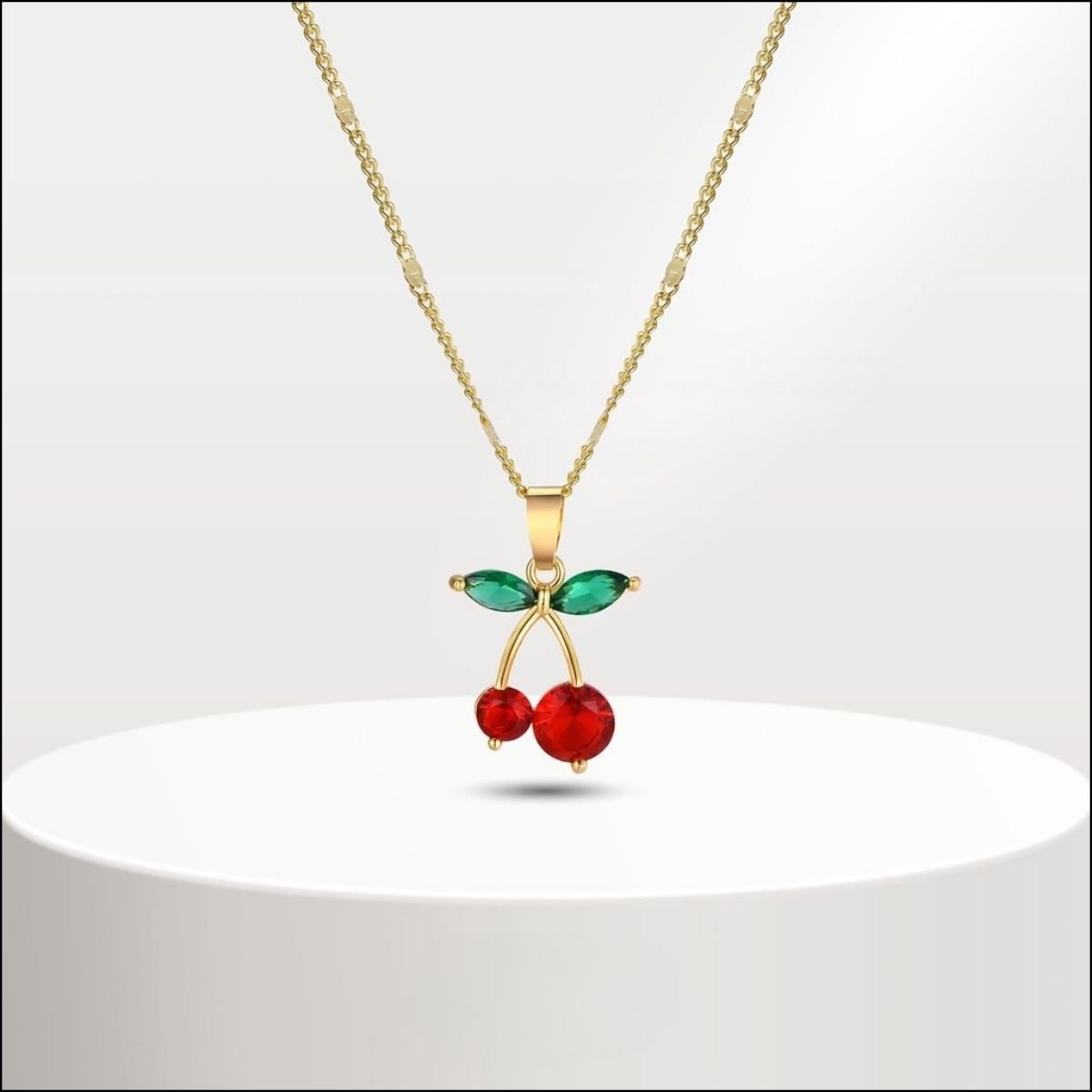 Son pendentif en forme de cerise arbore deux cristaux rouges étincelants, sublimés par des feuilles ornées de strass brillants et d’un éclat vert lumineux. Monté sur une chaîne dorée délicate, ce collier devient un véritable accessoire tendance qui attire instantanément les regards.