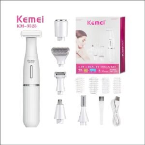 La tondeuse 6 en 1 Kemei KM-3523, élégante et sans fil, offre précision, polyvalence et 60 min d’autonomie pour un soin complet du visage et des zones délicates.
