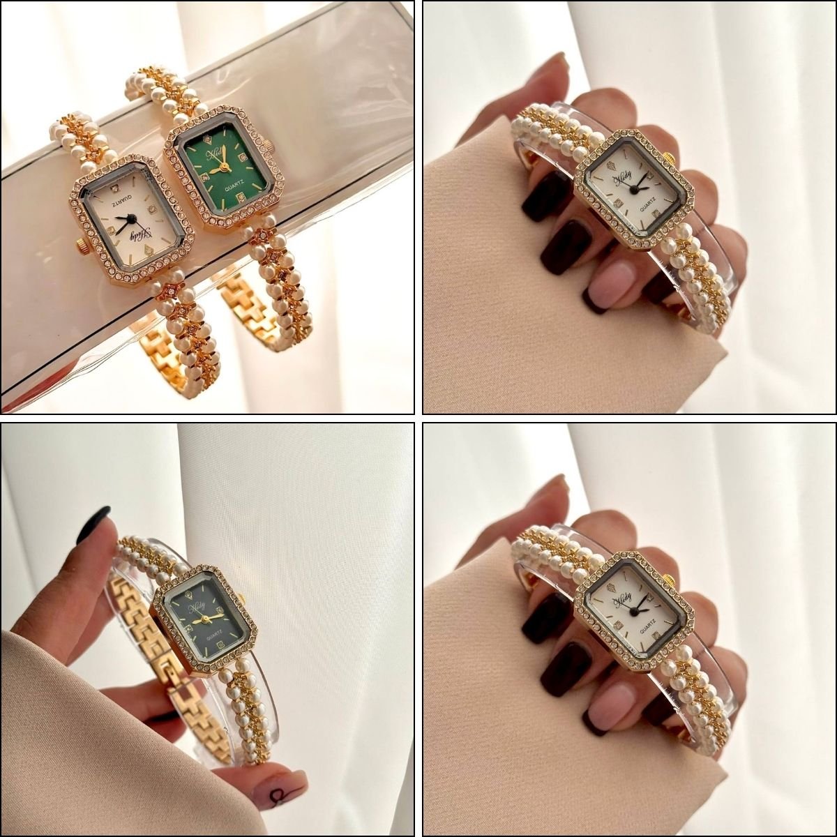 Le design se distingue par son bracelet sophistiqué composé d’une double rangée de perles nacrées. Chaque perle est délicatement maintenue par des fixations dorées, créant un contraste lumineux et raffiné qui sublime la carnation de la peau. Le fermoir à maillons dorés assure une fermeture sécurisée et une finition soignée à l’arrière du poignet.