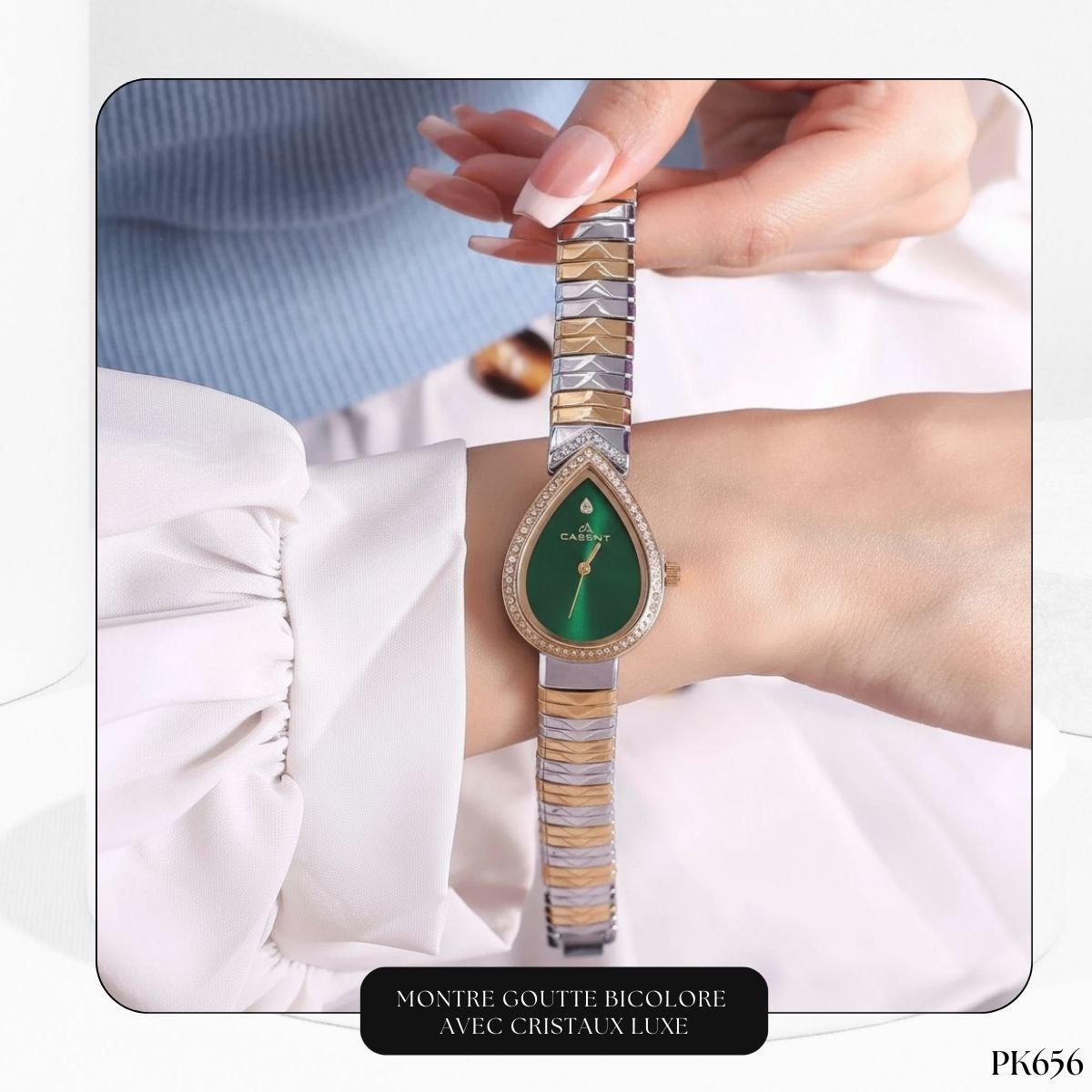 Ce modèle se distingue par son superbe bracelet bicolore en acier inoxydable, mêlant l’éclat de l’argent à la chaleur de l’or. Cette polyvalence vous permet de l’associer facilement avec tous vos autres bijoux, qu’ils soient en or ou en argent. La lunette dorée est délicatement sertie de cristaux scintillants, encadrant un cadran épuré qui reflète un luxe discret mais affirmé.