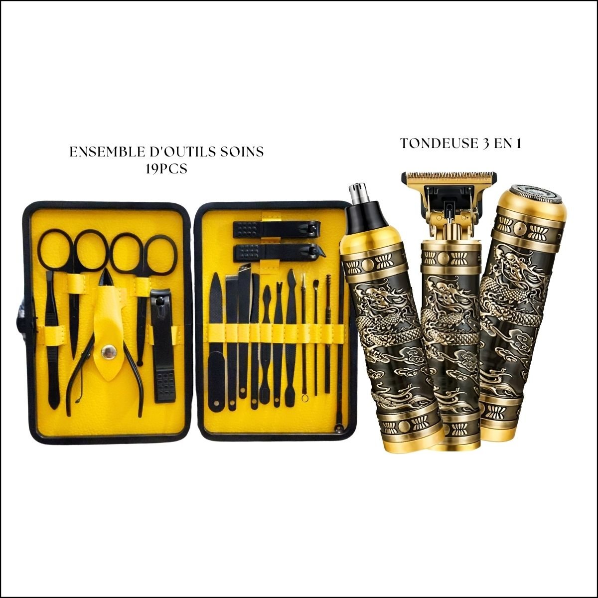 Optimisez votre routine de soins avec le pack exclusif. Ce coffret rassemble un kit de manucure-pédicure de 19 pièces et une tondeuse 3-en-1 performante. C’est l’outil parfait pour l’homme moderne soucieux de son apparence. Adoptez une hygiène irréprochable et un style impeccable.
